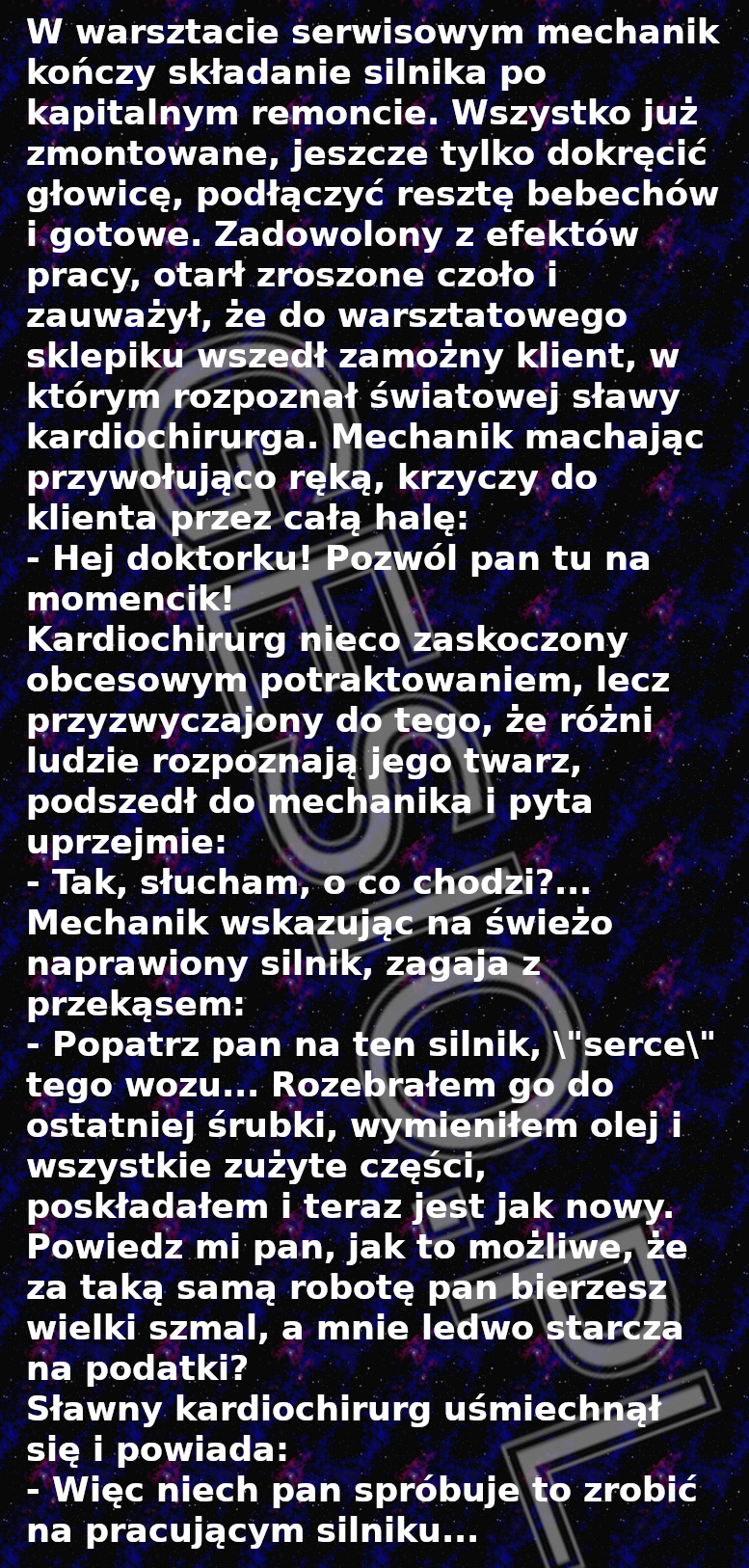 Humor: W warsztacie serwisowym mechanik kończy składanie silnika